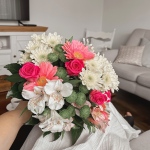 Bukiet Słoneczne życzenia to radosna, słoneczna kompozycja stworzona z myślą o wyjątkowych okazjach i codziennych gestach serdeczności. W bukiecie przeważają świeże, wyraziste kwiaty: różowe róże, gerbery w tonacji jasnoróżowej i fuksji, soczyście żółte chryzantemy, delikatne alstromerie w odcieniach kremu oraz różu, subtelne zielone dodatki florystyczne i świeża zieleń liści. Bukiet utrzymany jest w letnim, optymistycznym stylu – łączy w sobie naturalność, wyjątkowe połączenie kolorów i elegancki, a zarazem uniwersalny wygląd, który sprawdzi się zarówno w roli prezentu, jak i dekoracji wnętrza.