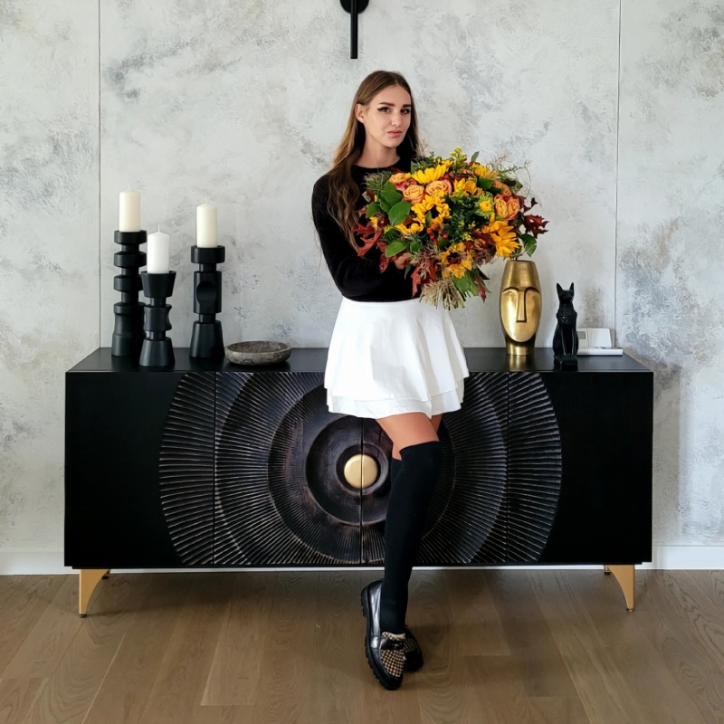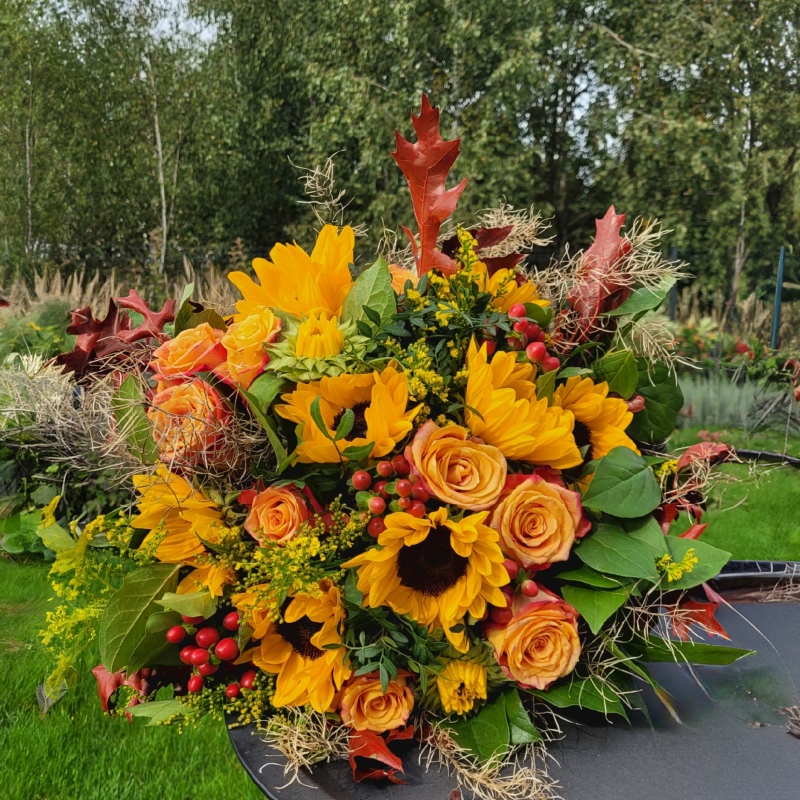 Bukiet utrzymany jest w stylu kolorystycznej eksplozji, łącząc żywe odcienie pomarańczu, żółci, zieleni i czerwieni. To kompozycja pełna energii i ciepła, z lekkim akcentem jesiennym, idealna dla osób ceniących pogodny, optymistyczny charakter kwiatów i wszechstronną elegancję. Urozmaicone dodatki sprawiają, że całość wygląda niepowtarzalnie i wyjątkowo, a każdy bukiet nabiera indywidualnego charakteru.