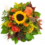Radosny, mieszany bukiet w kolorystyce żółto-pomarańczowej wywoła uśmiech na każdej twarzy. Bukiet pokazany na zdjęciu w wersji średniej składa się z 9-12 kwiatów z przybraniem.